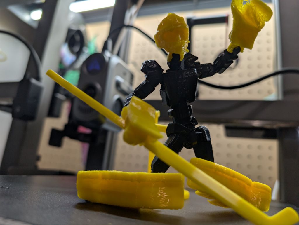 I scanned his leg pads, his blocker, and his glove. And I took the head from the scan for the figurine and was able to fuse it to the neck coupler of the Dummy 13 model. Then I realized that the regular Dummy 13 was not “buff” enough to look like a hockey goalie, so I was able to find a thicker chest piece, and also some shoulder pads.