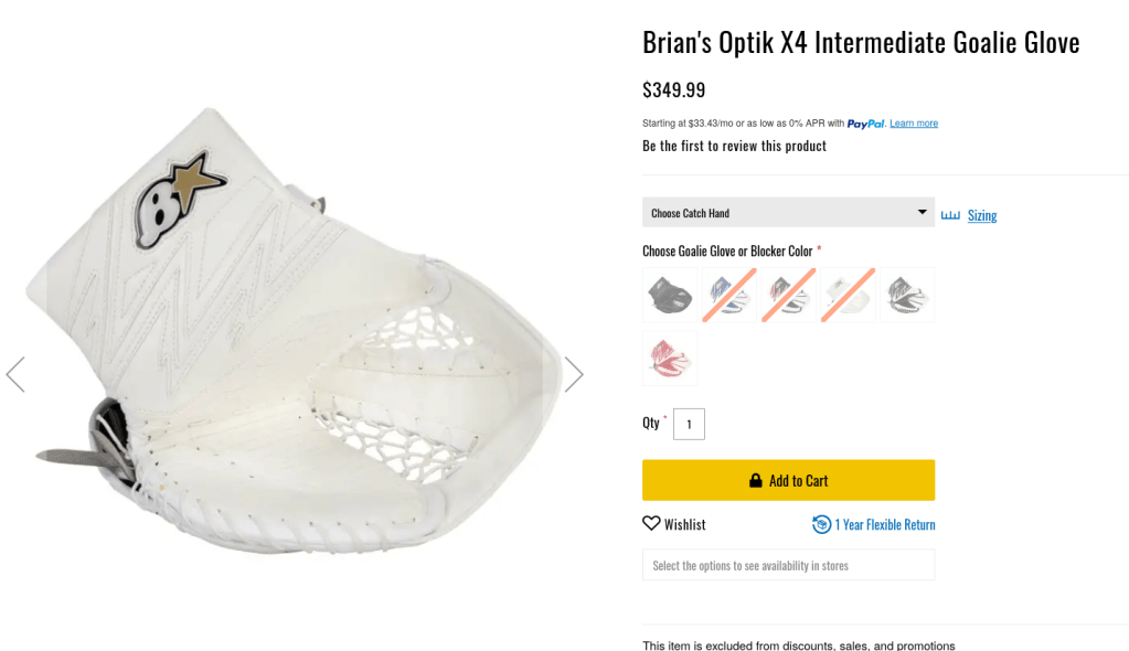 The goalie glove is not a cheap purchase. Our family personally likes to visit goaliemonkey.com to see what we can find. Here is an example of my son’s favorite glove.