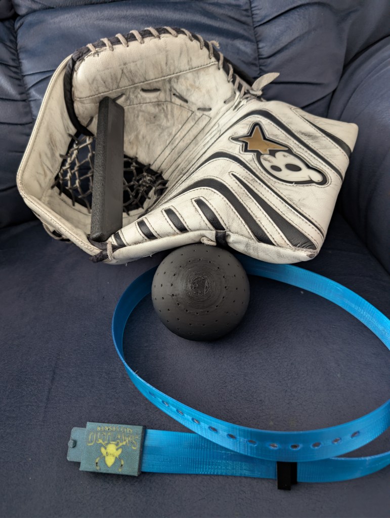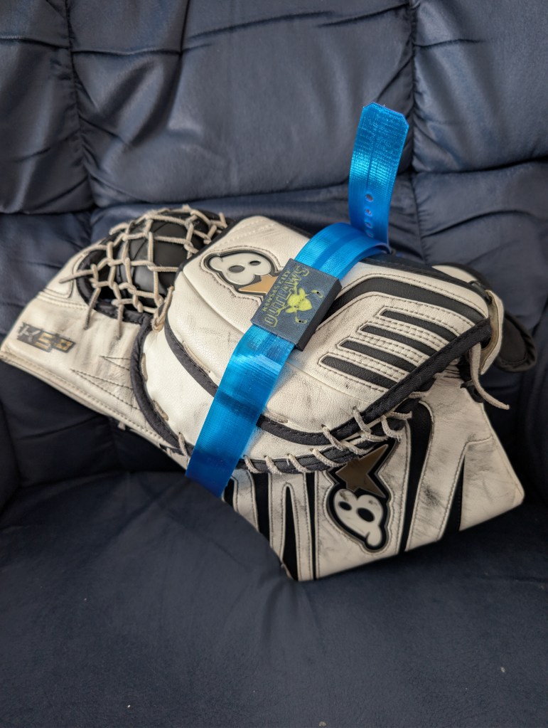 You will notice in the picture I have a belt to wrap around the glove when the trainer is inside. We have used a rubber band, or a practice jersey to wrap around the glove and those work just fine. (the rubber band is probably better, but I like 3d printing.) The belt I used to wrap around the glove is a design by Guillaume Gendron and can be found on the printables website, by searching TPU belt with a compact box-style buckle. I did modify the buckle a bit by adding my son’s hockey team’s logo, and since the belt was too long for the glove I added a piece from another file designed by Dugacki on printables also, to hold the excess of the belt. I probably could have spent time modifying the belt to specifically meet the needs, but to be honest, if something is already designed why reinvent the wheel, or belt.
